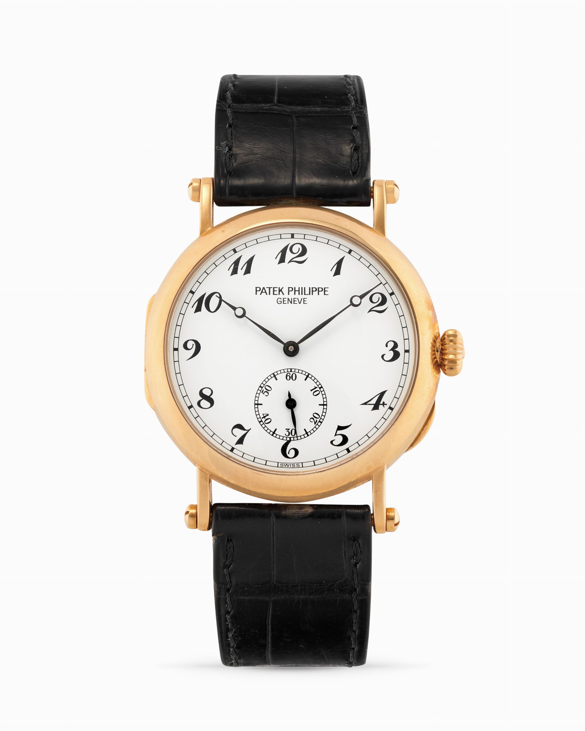 anni 80s Cassa rotonda in oro 18k, n.2863138, fondello a cerniera, anse Officer. Quadrante in smalto bianco, numeri arabi dipinti. Movimento a carica manuale, cal.215, n.768226. Cinturino Patek Philippe in pelle e fibbia Patek Philippe in oro.* Dimensioni: 34 mm. Accompagnato da doppia garanzia, libretti, porta libretti in pelle e pochette Patek Philippe.