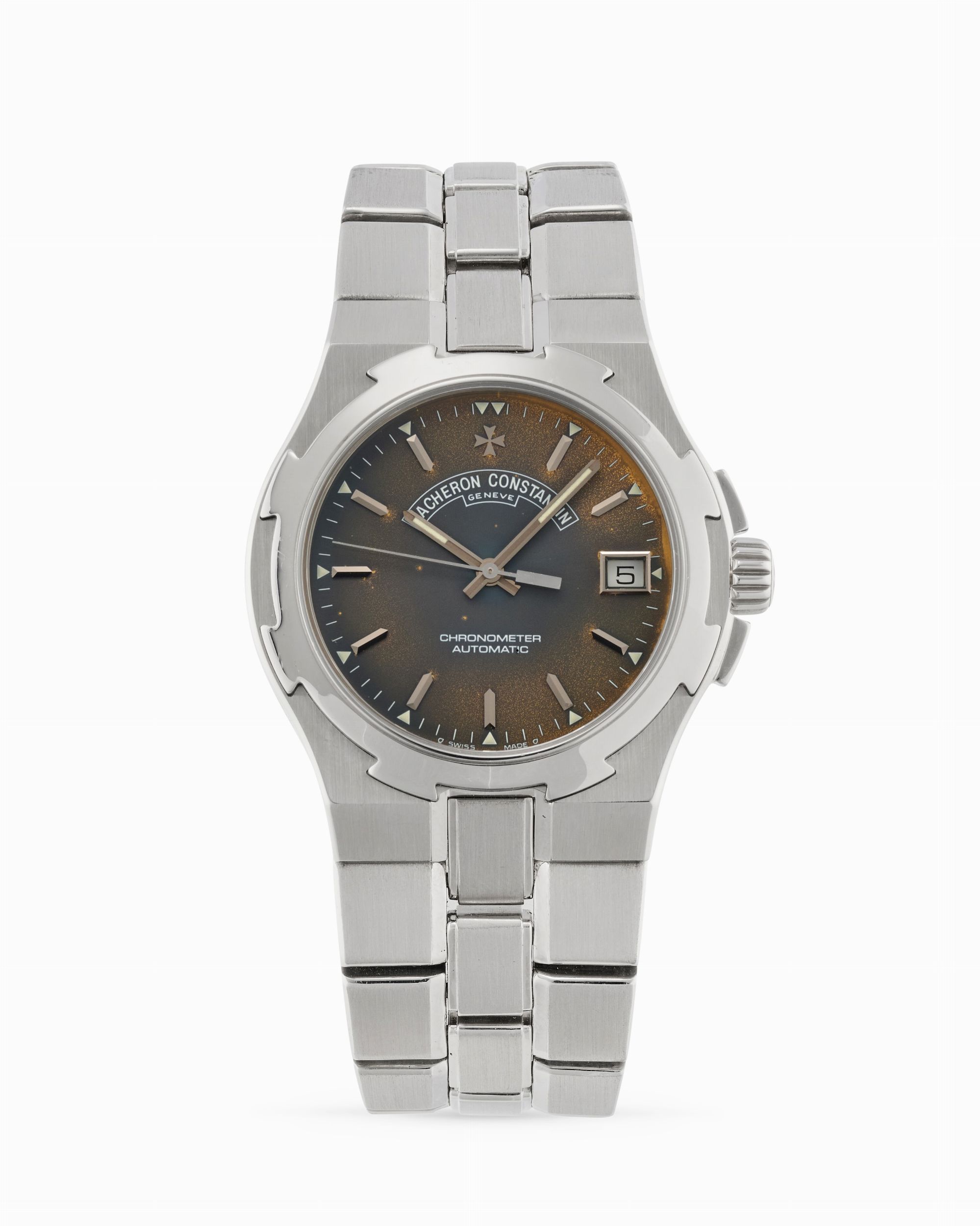 anni 2000 Cassa ottagonale in acciaio, n.712771, lunetta tonda in acciaio a Croce di Malta stilizzata, fondello a vite con medaglione veliero. Quadrante blu virato al marrone, indici applicati. Movimento a carica automatica, cal.1311. Bracciale integrato Vacheron Constantin in acciaio. Dimensioni: 37 mm. Accompagnato da garanzia, libretti, bollettino di marcia e scatola Vacheron Constantin.
