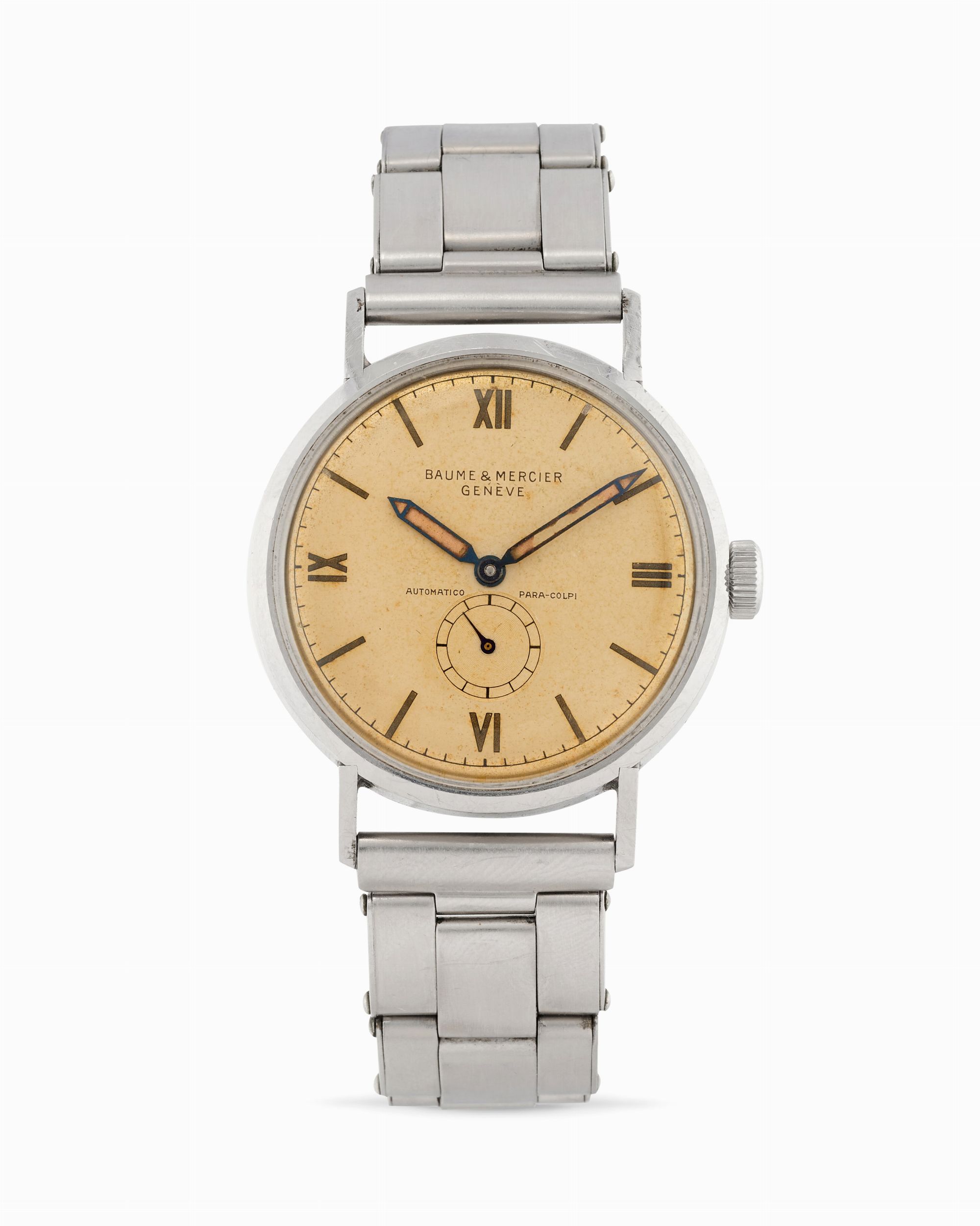 anni 50 Cassa rotonda in acciaio, n.326587, fondello a vite. Quadrante color crema, indici e numeri romani luminescenti. Movimento a carica automatica. Bracciale in acciaio a maglie rivettate. Dimensioni: 33 mm.