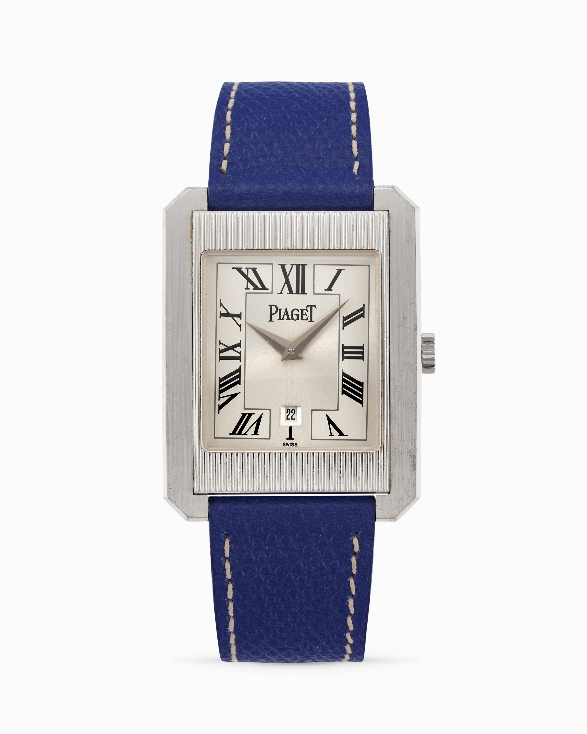 anni 90 Cassa rettangolare in oro bianco 18k con finitura godronata, n.864834. Quadrante argenté a due toni, numeri romani dipinti. Movimento al quarzo. Cinturino in pelle e fibbia Piaget in oro bianco. Dimensioni: 40 x 31 mm.