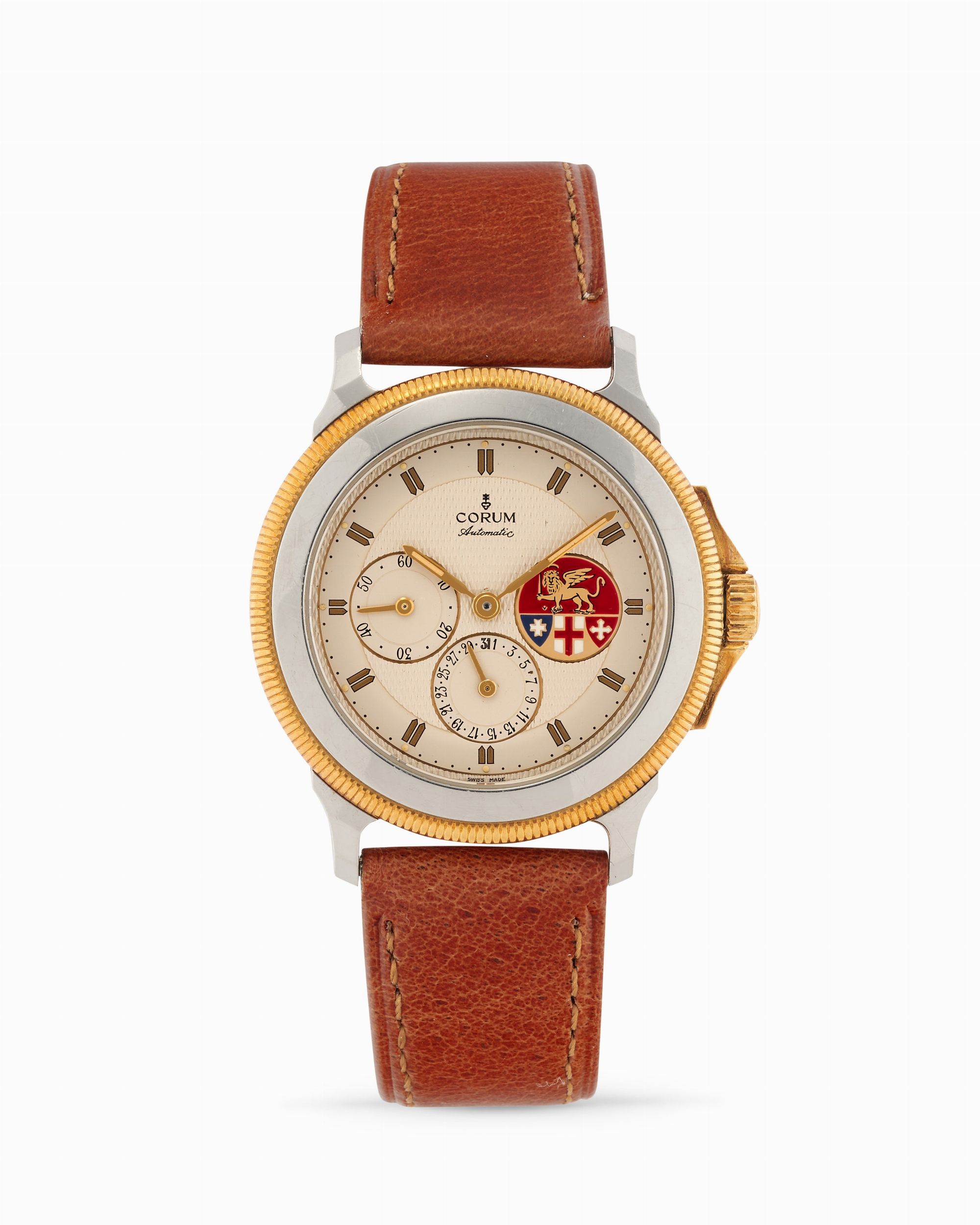 anni 90 Cassa rotonda in acciaio, lunetta scannellata in oro 18k. Quadrante color crema con finitura guilloché, logo delle quattro Repubbliche Marinare, indici dipinti. Movimento a carica automatica. Cinturino in pelle. Dimensioni: 34 mm. Accompagnato da garanzia, libretti e custodia in pelle Corum.