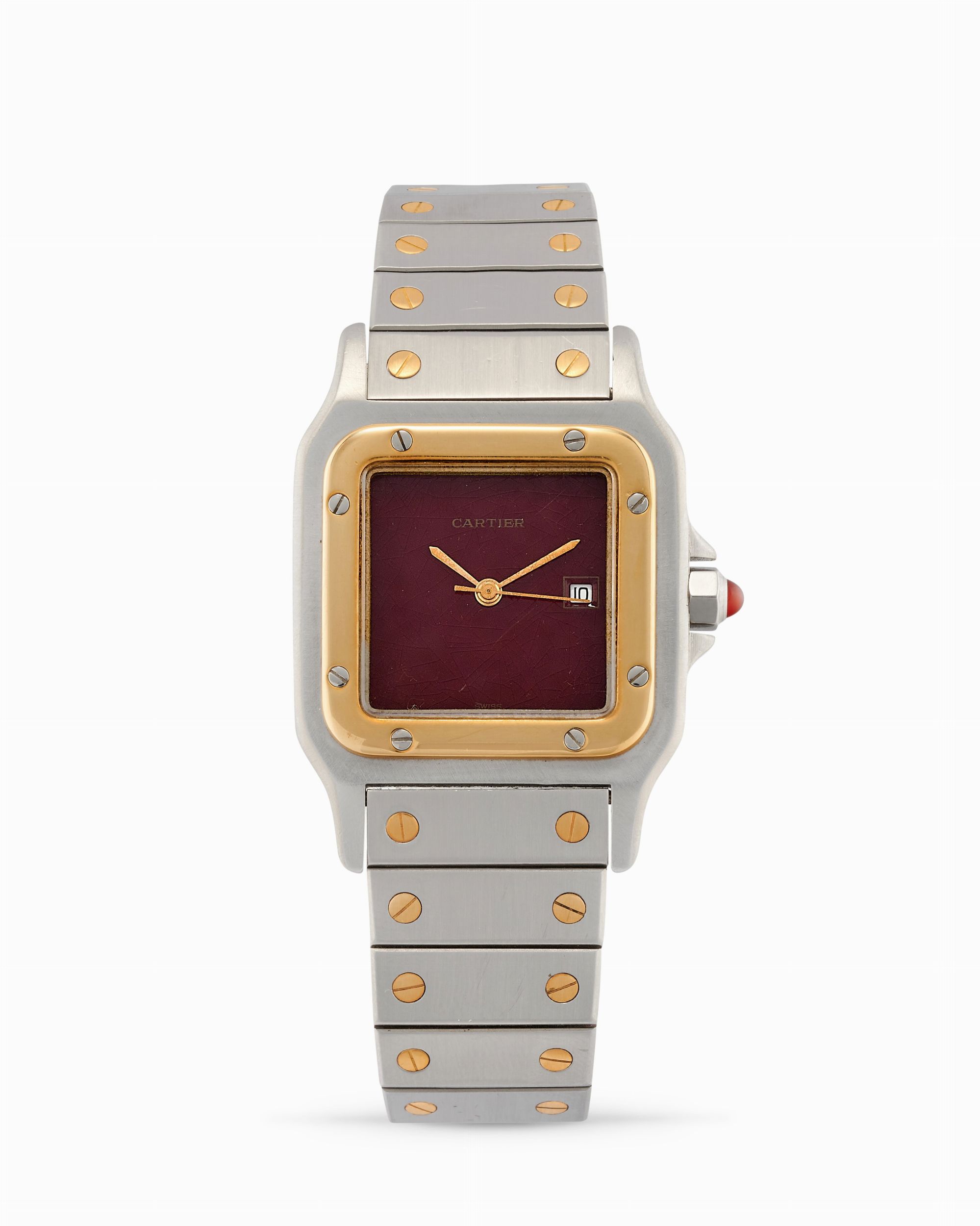 anni 90 Cassa quadrata in acciaio, n.61324, lunetta in oro 18k. Quadrante in lacca bordeaux craquelé. Movimento a carica automatica. Bracciale Cartier in acciaio e oro 18k. Dimensioni: 29 x 29 mm.