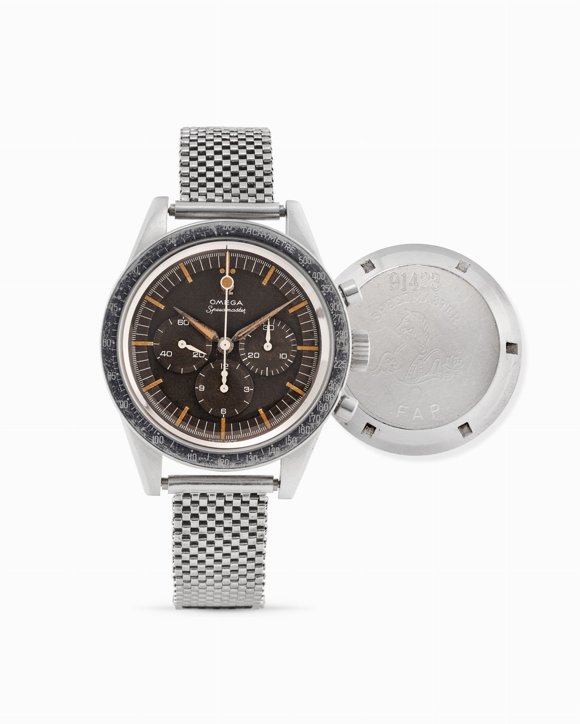 anni 60 Cassa rotonda in acciaio, lunetta 'Dot over ninety' nera virata al grigio in alluminio, pulsanti tondi, anse dritte. Quadrante nero con gradino virato al marrone, logo applicato, sfere 'Alpha' e 'Lollipop', indici luminescenti. Movimento a carica manuale, cal.321, n.17762315. Bracciale Forstner in acciaio. Dimensioni: 39 mm. Accompagnato da estratto d'archivio Omega.