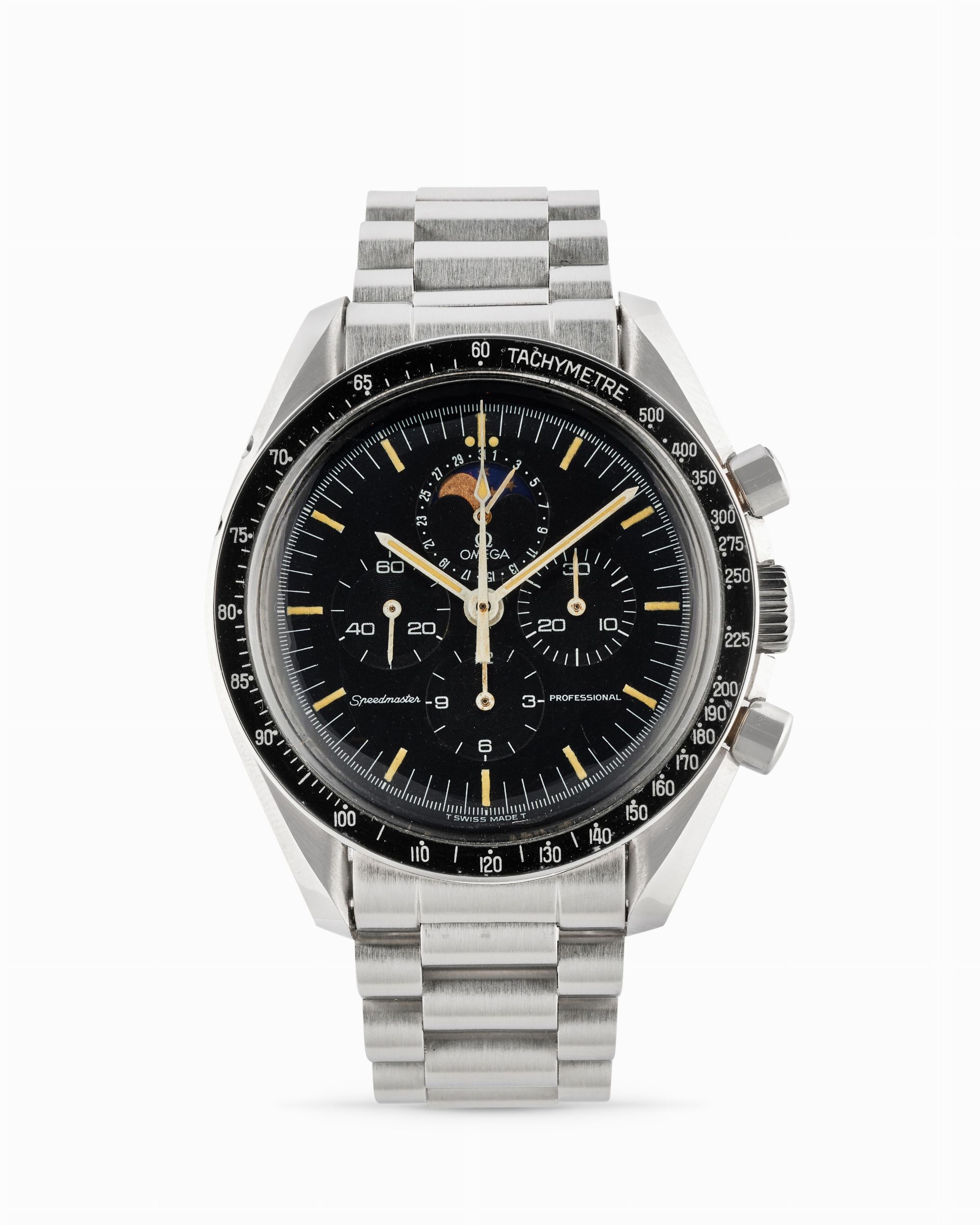 anni 80 Cassa rotonda in acciaio, lunetta nera in alluminio, pulsanti tondi, anse a lira. Quadrante nero, indicazione della data, fasi lunari e contatori cronografia, indici luminescenti. Movimento a carica manuale, cal.866, n.47132911. Bracciale Omega 1450 in acciaio. Dimensioni: 42 mm. Accompagnato da estratto d'archivio Omega.
