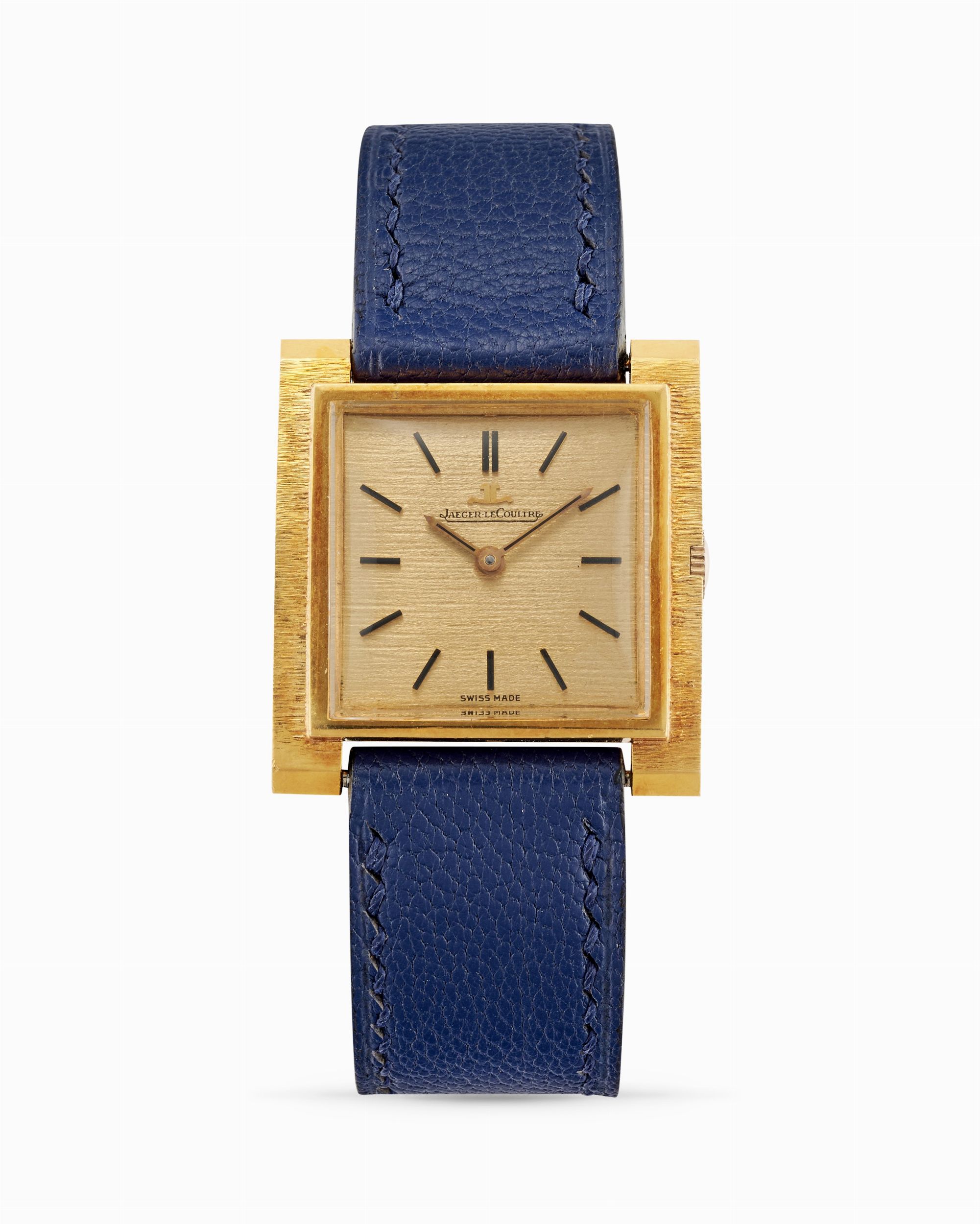 anni 70 Cassa rettangolare in oro 18k con finitura corteccia, n.1055615. Quadrante champagne con finitura corteccia, indici applicati smaltati. Movimento a carica manuale, cal.K818. Cinturino in pelle. Dimensioni: 30 x 28 mm.