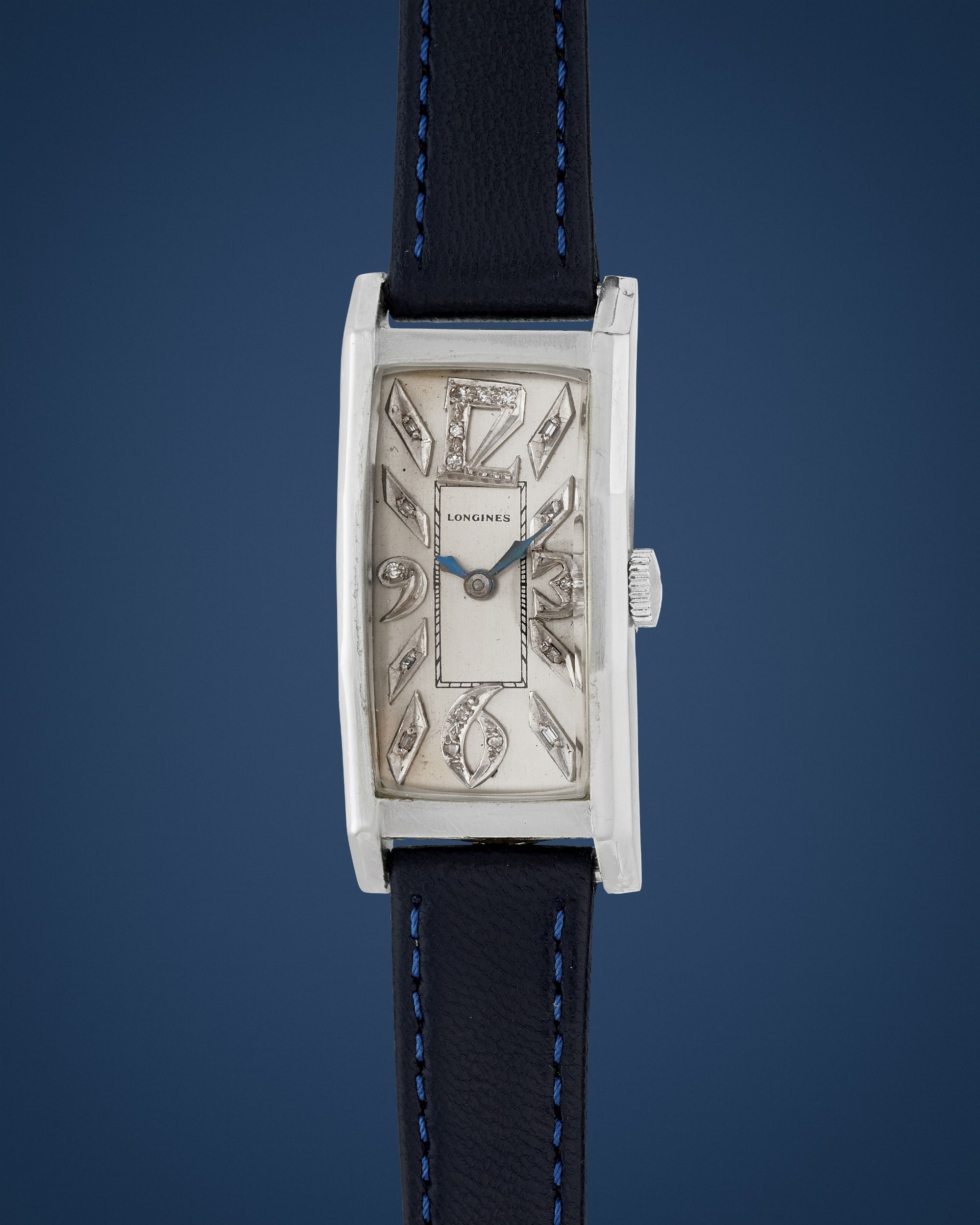 anni 40 Cassa rettangolare curva in platino. Quadrante argenté, indici e numeri arabi settati diamanti applicati. Movimento a carica manuale, cal.9L, n.6062918. Cinturino in pelle. Dimensioni: 44 x 19 mm. Accompagnato da estratto d'archivio Longines.