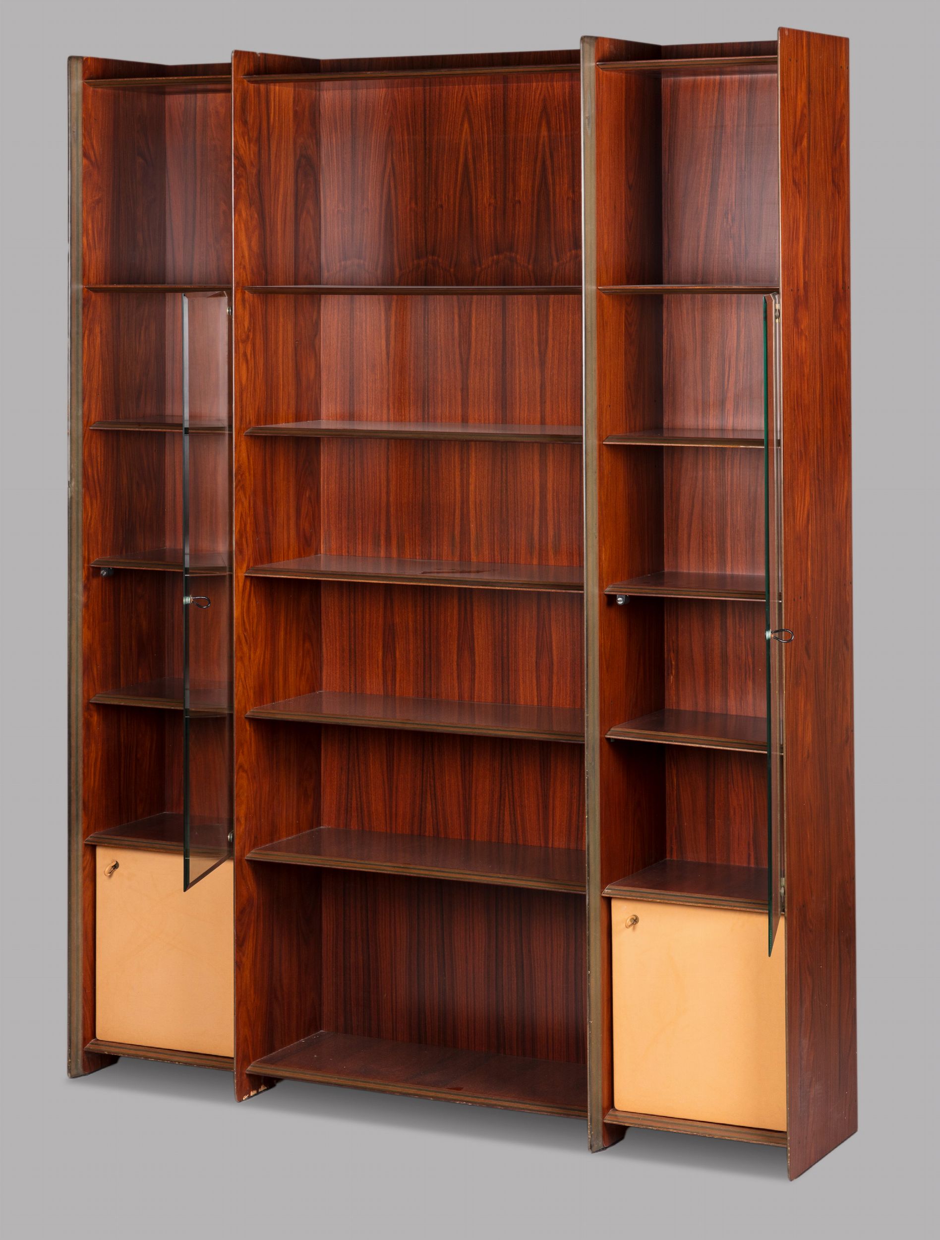 1970 ca. libreria con struttura in legno e radica e ante in vetro Produzione Maxalto