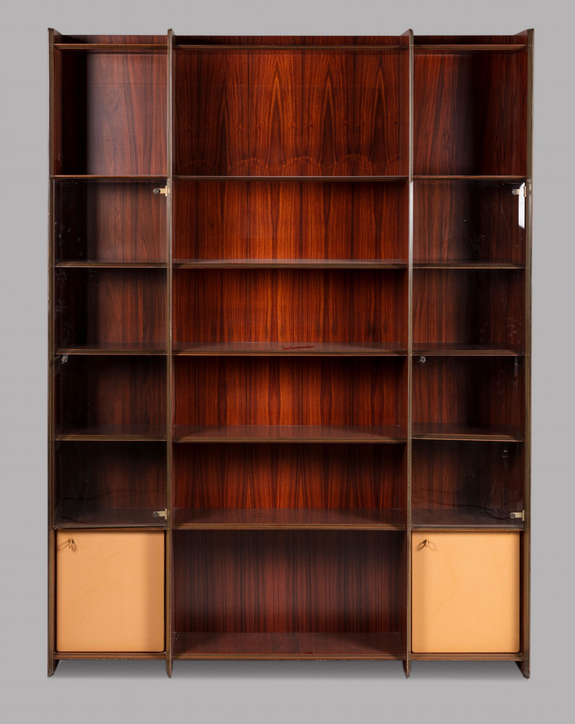 1970 ca. libreria con struttura in legno e radica e ante in vetro Produzione Maxalto