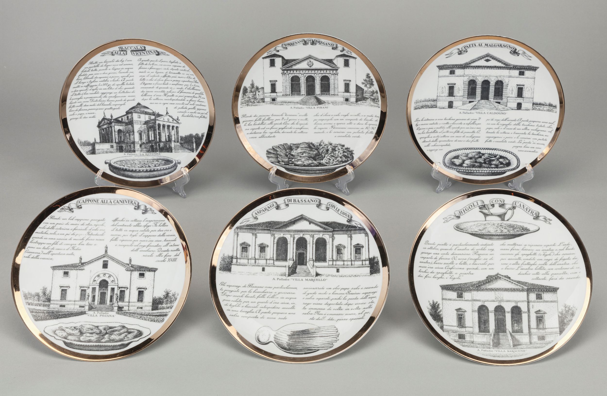 1960 ca. composta da sei piatti dalla serie 'Ville venete e ricette vicentine', in porcellana bianca e oro, decoro serigrafato Produzione Fornasetti Italia marcate e numerate sotto la base