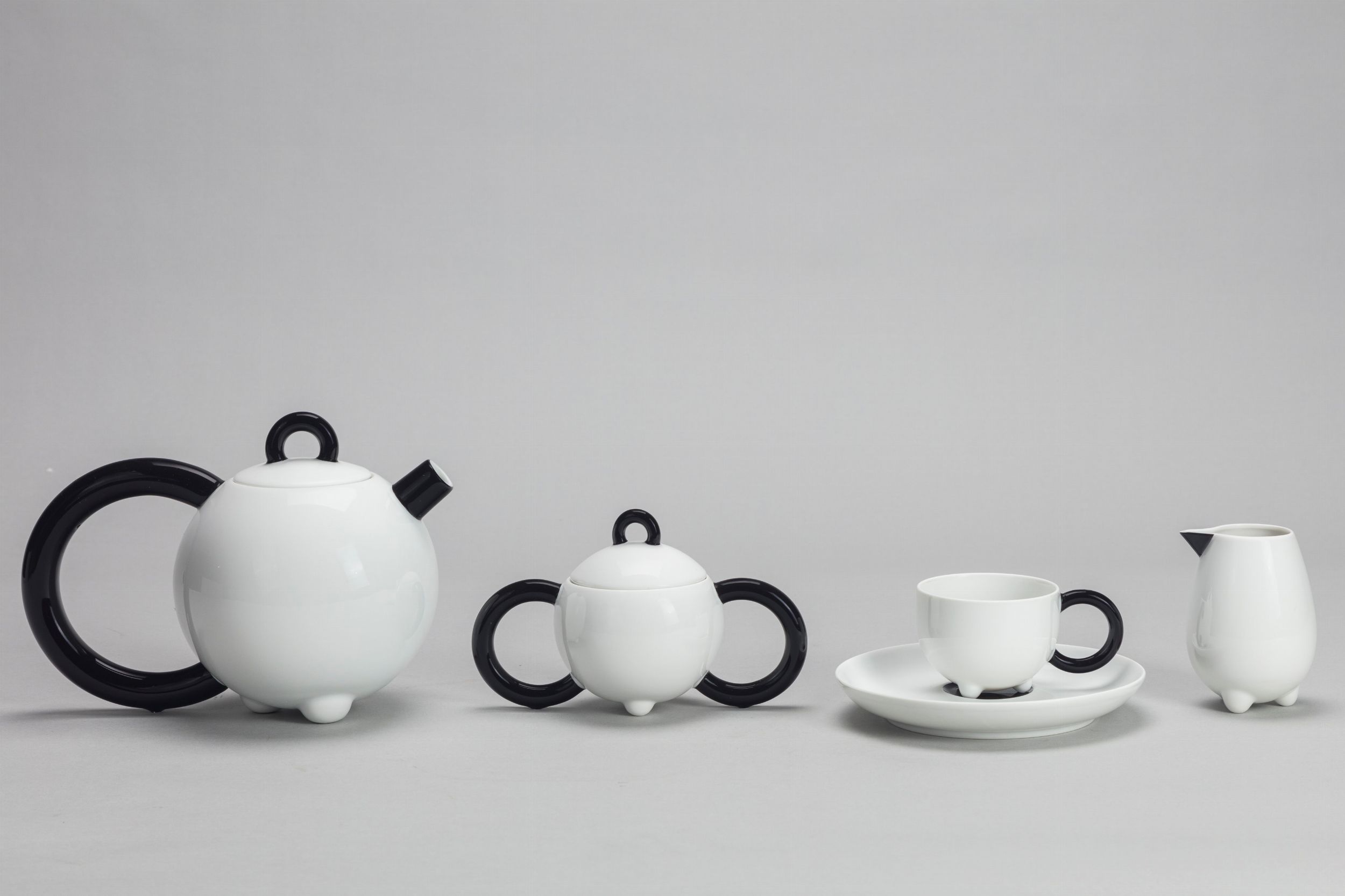 1980 ca. sevizio per colazione, composto da una teiera, una zuccheriera, una lattiera e una tazza con piattino, in porcellana smaltata in bianco e nero Produzione Arzberg
