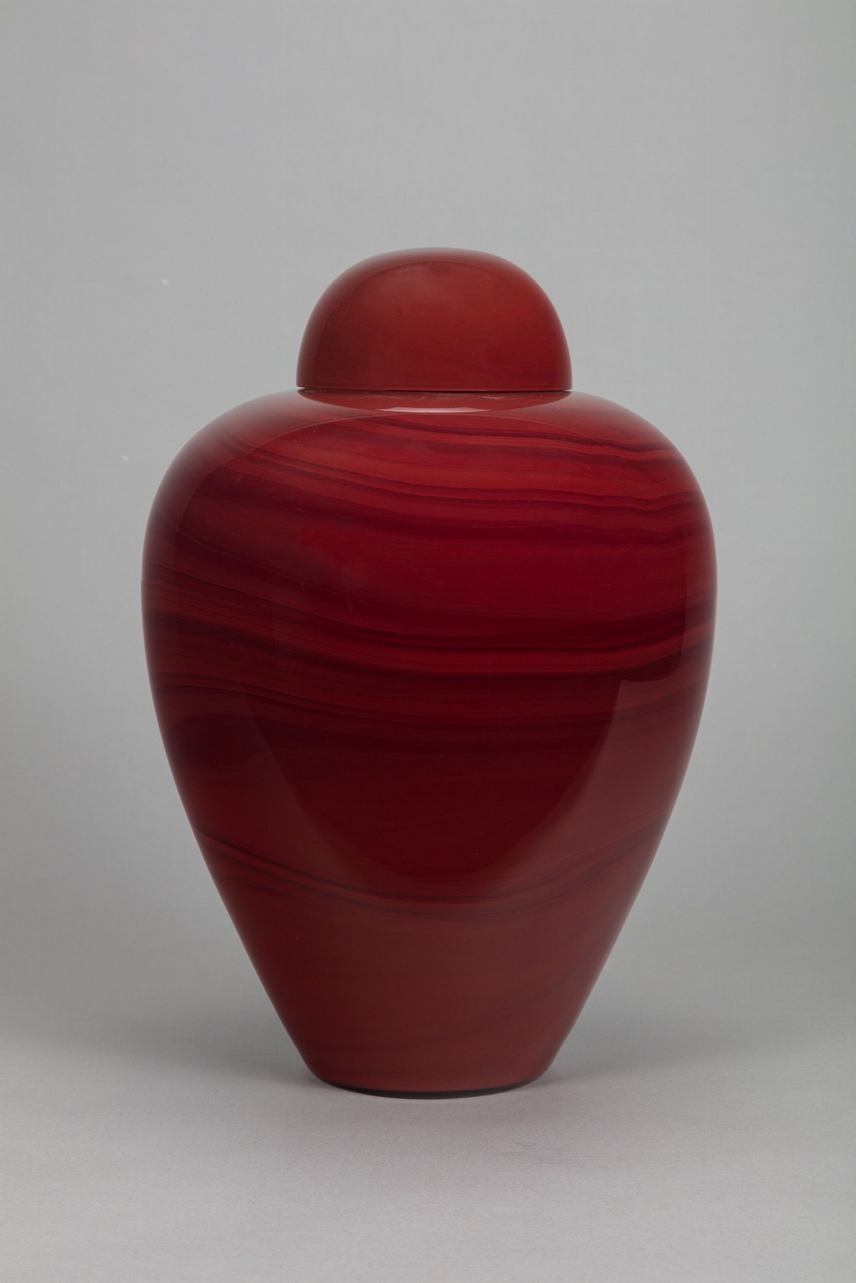 1970 ca. ad anfora con coperchio in vetro soffiato rosso marmorizzato Produzione Barovier e Toso Murano firma incisa sulla base