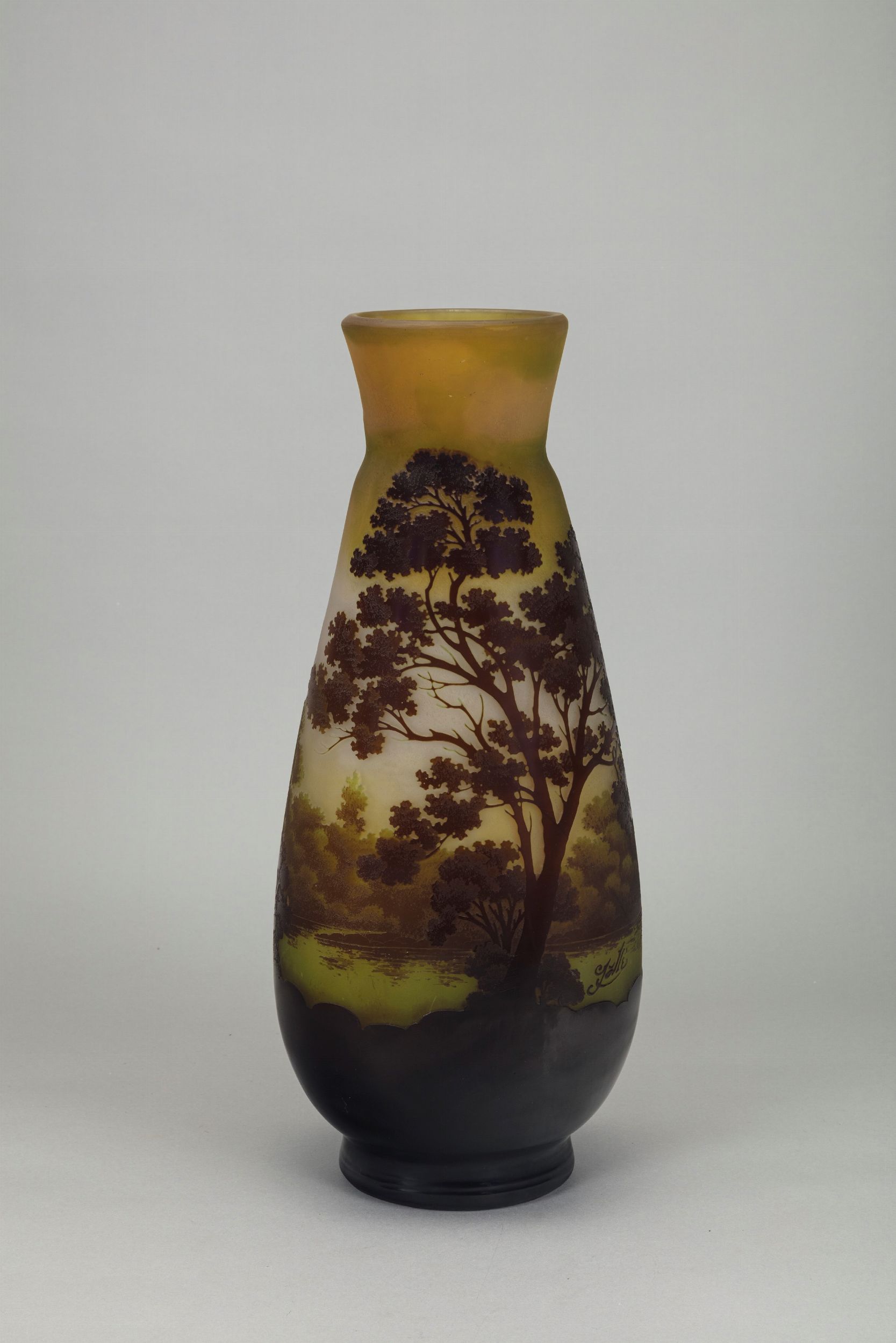 1900 ca. in vetro a strati di colore, lavorazione a cammeo, decorazione con paesaggio lacustre. Produzione vetrerie Gallé. Firma a cammeo sul fianco
