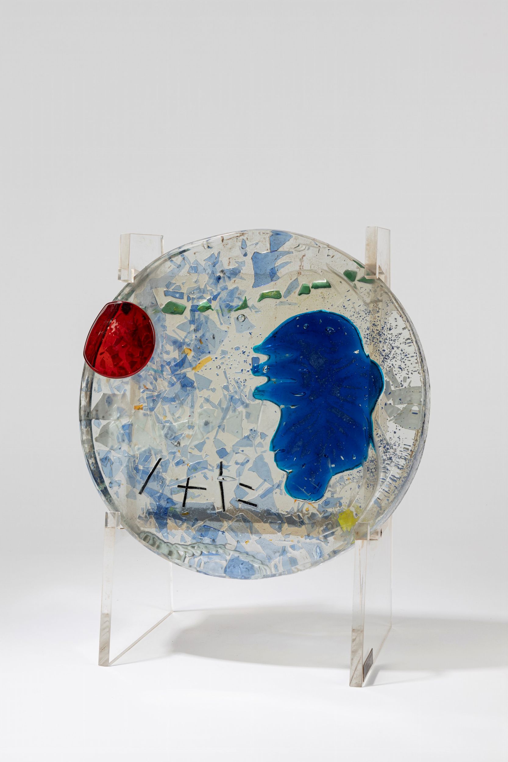 1978 disco in vetro trasparente con scritte rosso, bleu, biancolatte, turhcese, bluino e con testa bleu sommersa. L'opera è montata su leggio in plexiglass trasparente. Produzione Fucina degli Angeli, Venezia Inciso sulla base: James Coignard - Egidio Costantini 1978 - © Fucina degli Angeli Venezia.
