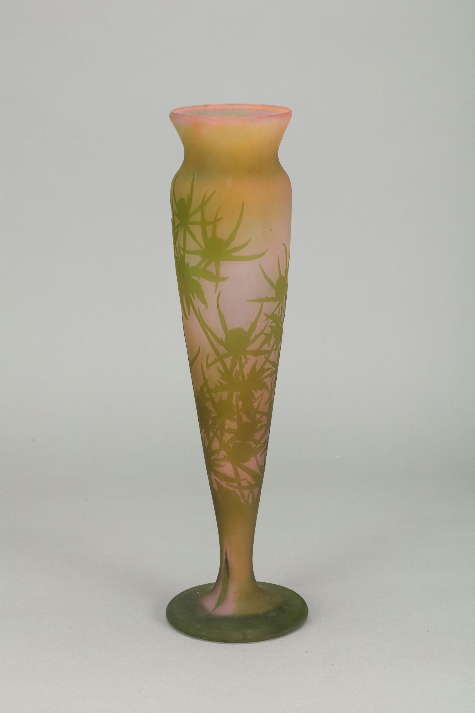 1900 ca. in vetro a strati di colore, lavorazione a cammeo, decorazione con cardi. Produzione vetrerie Gallé. Firma a cammeo sul fianco