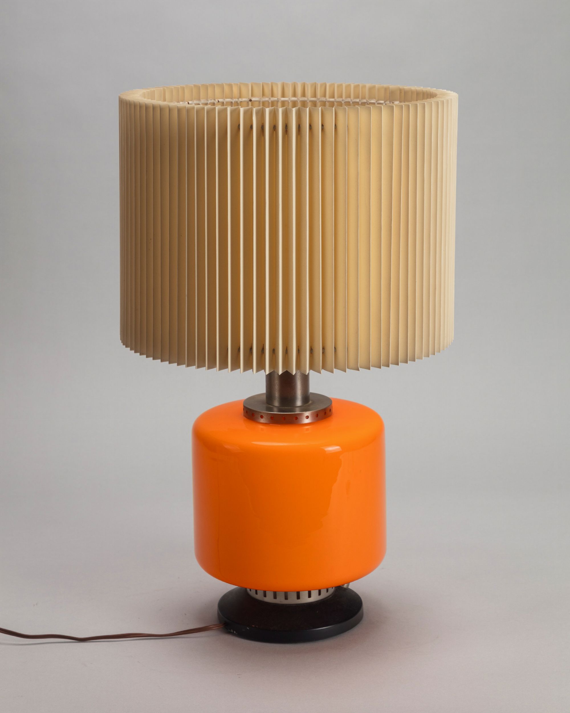 1960 ca. base in vetro incamiciato e paralume in materiale plastico, dettagli in ottone verniciato Produzione Stilnovo