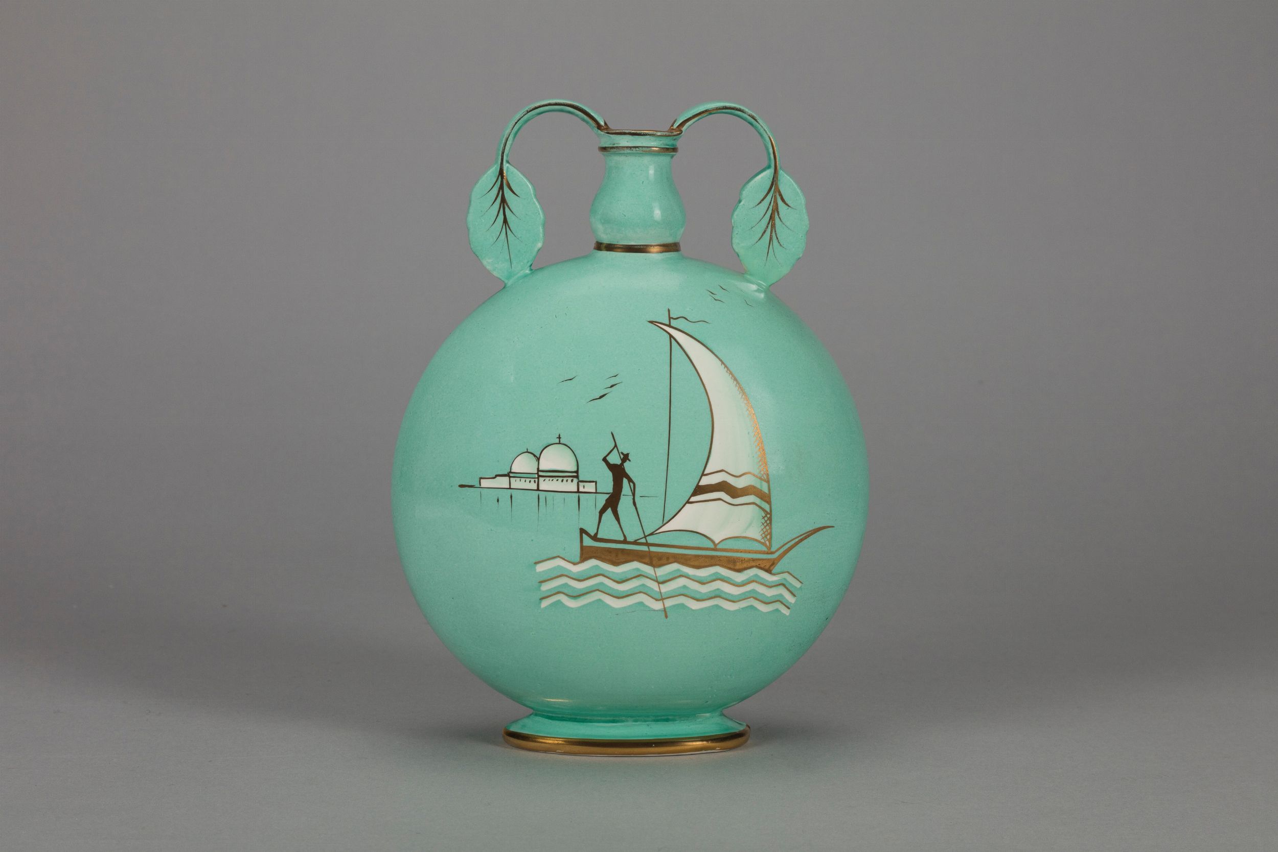 1928 ca. vaso a forma sferica con anse fitomorfe, decorato con scene marittime Produzione Società Italiana Ceramica Laveno firma sotto la base, marchio Laveno in blu
