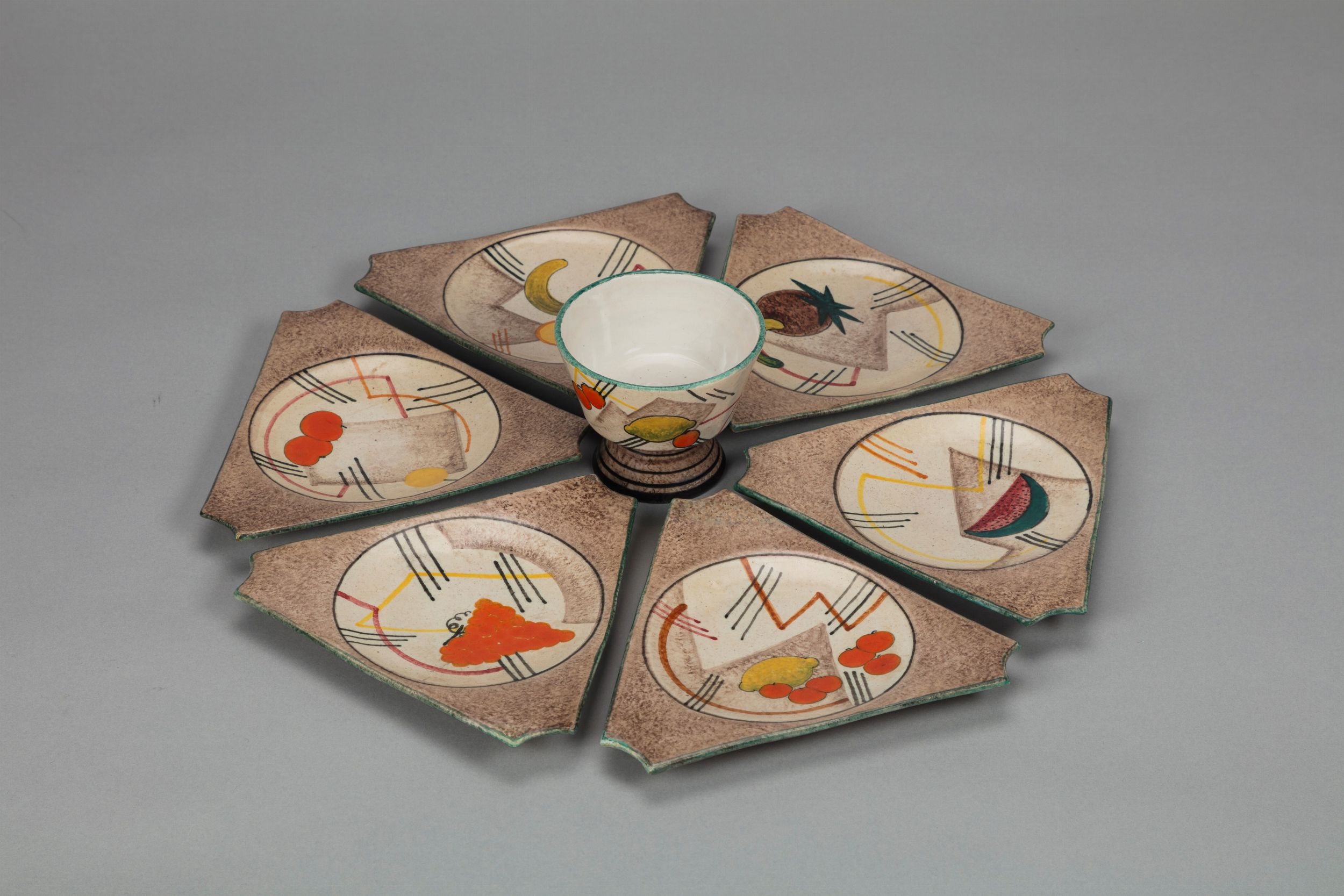 1930 ca. in terracotta maiolicata MATT composto da sei piattini più ciotola centrale Produzione Giuseppe Mazzotti Albisola firme MGA sotto la base