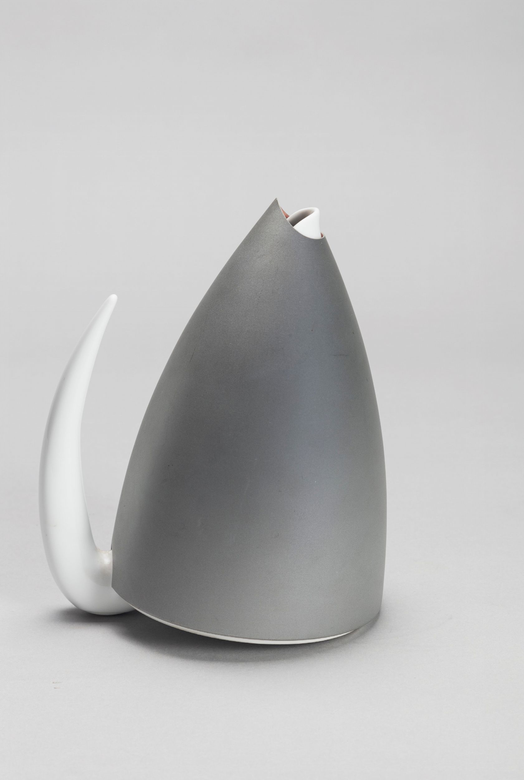 1991 teiera in porcellana bianca e schermatura in alluminio, filtro in acciaio Produzione Alessi firma del produttore serigrafata sulla base
