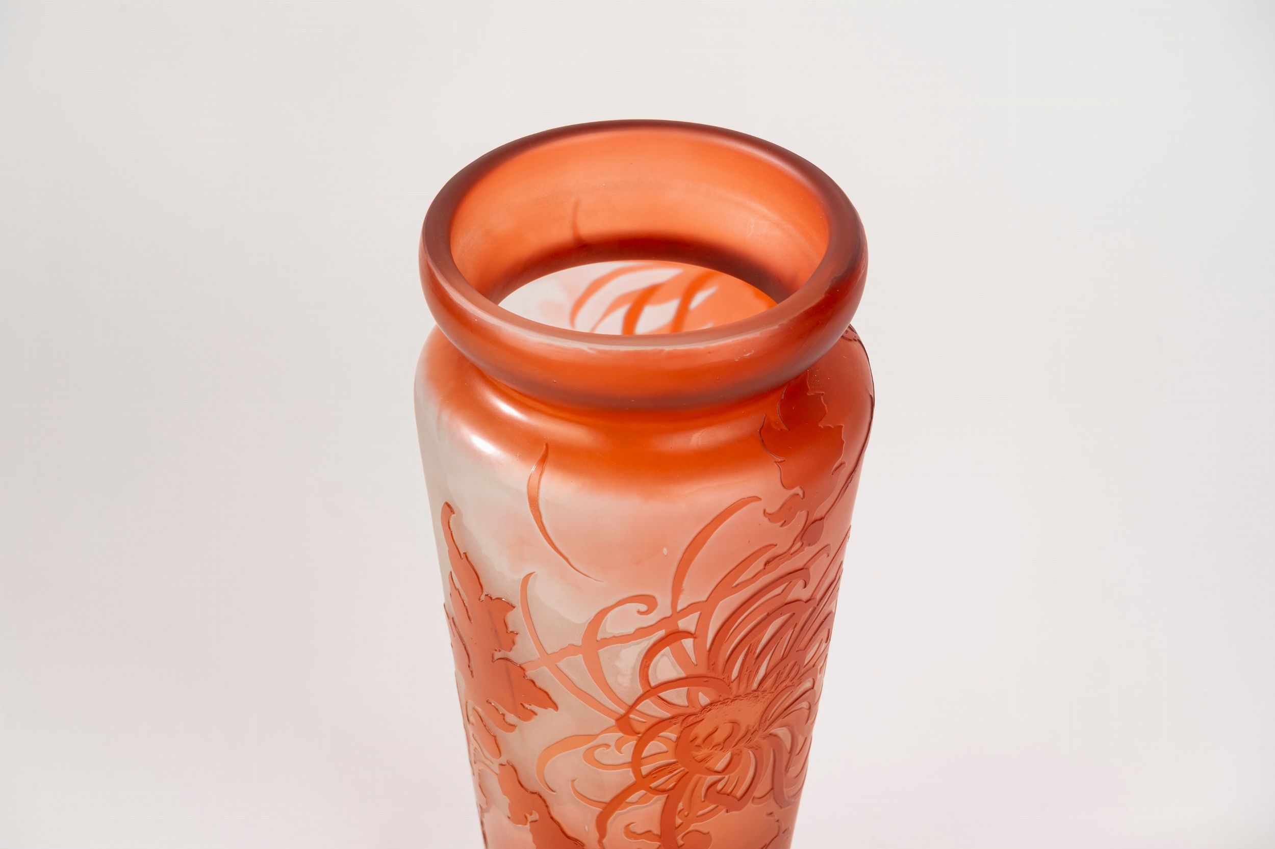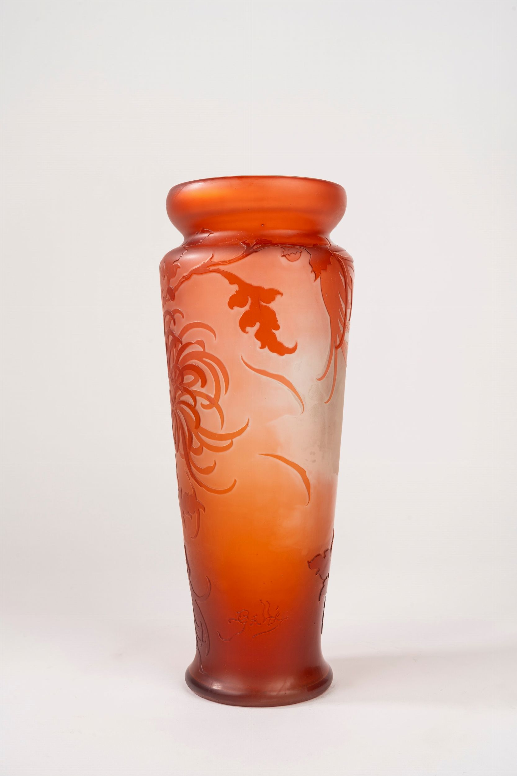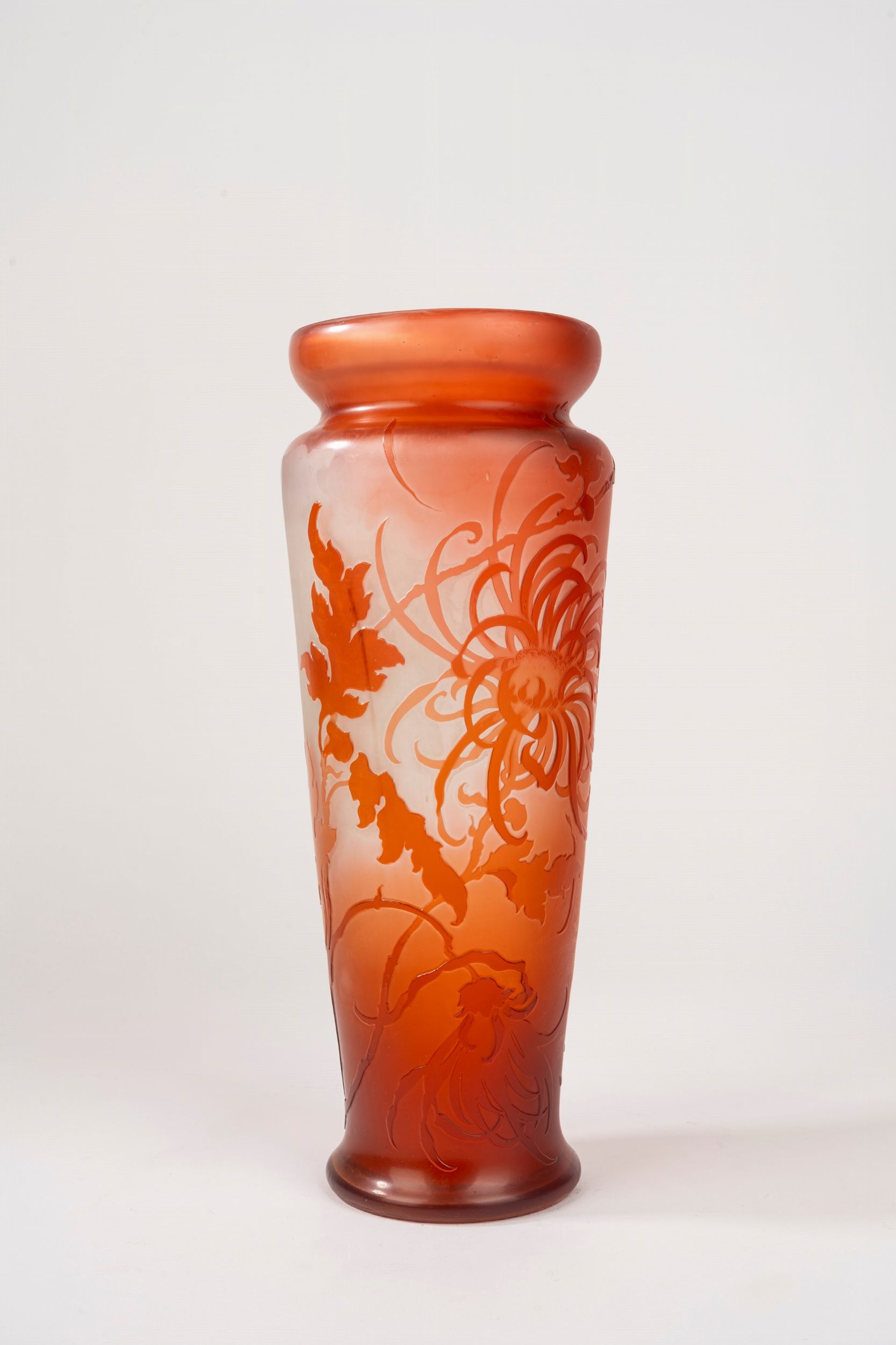 1900 ca. in vetro a strati di colore, lavorazione a cammeo, decorazione con crisantemi.  Produzione vetrerie Gallé. Firma a cammeo sul fianco