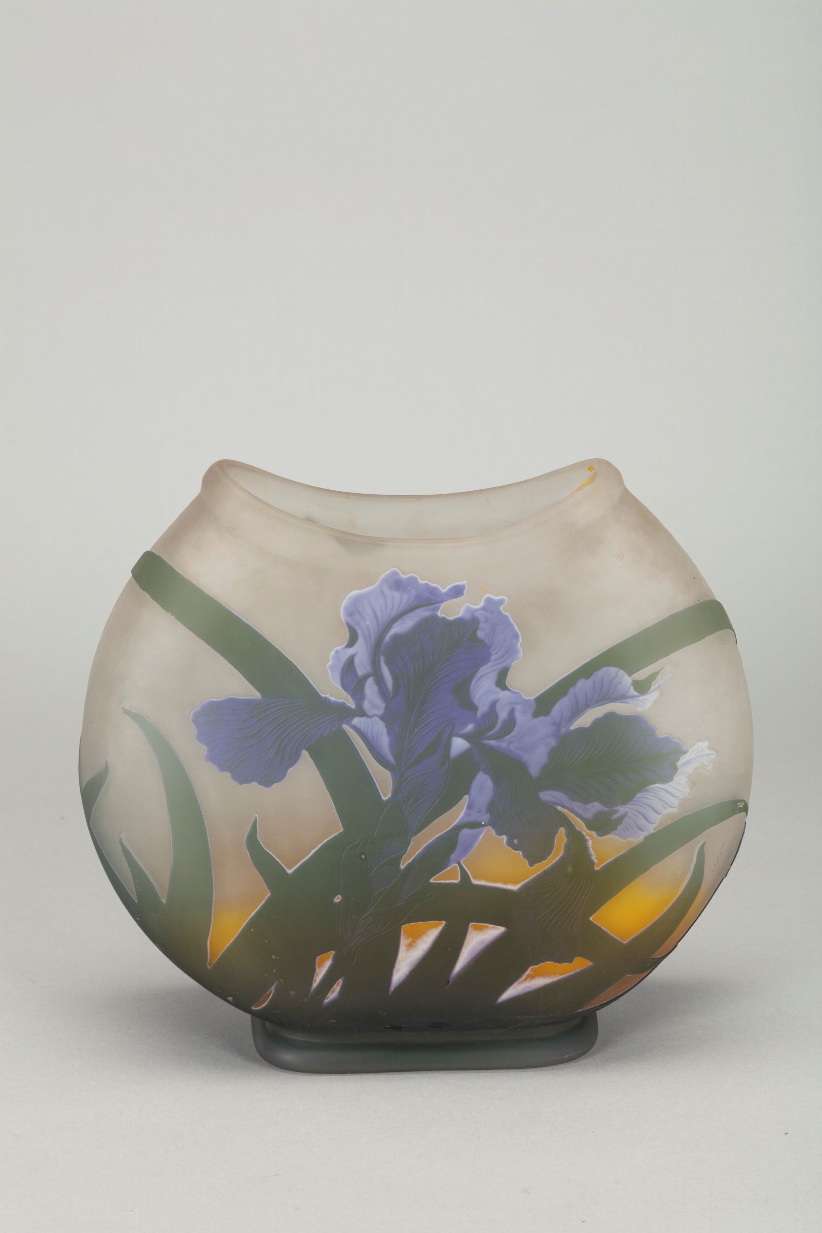 1900 ca. in vetro a strati di colore, lavorazione a cameo, decorazione con iris. Produzione vetrerie Gallè. Firma a cameo sul fianco.