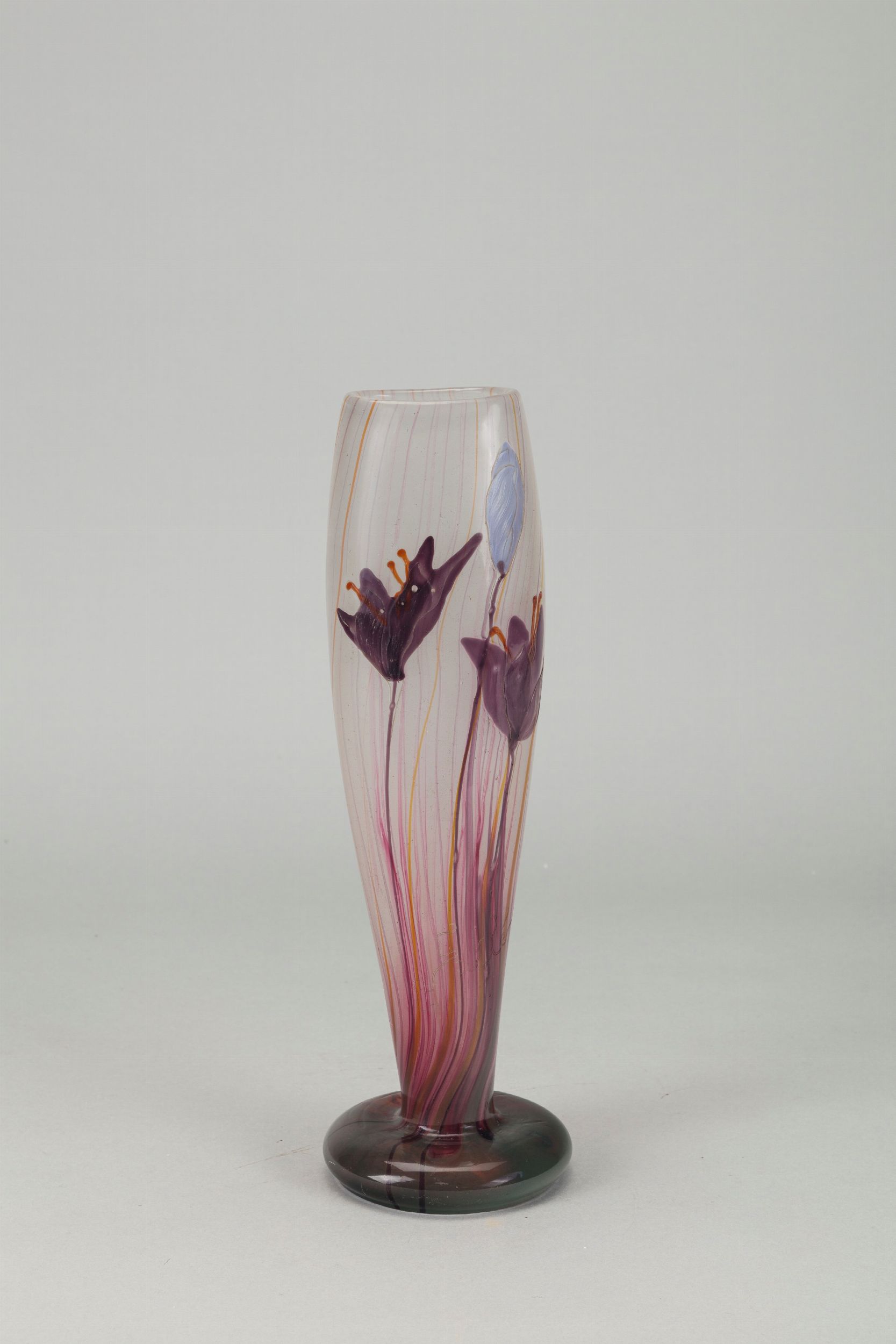 1900 ca. in vetro intarsiato, decorazione con crocus. Produzione vetrerie Gallé. Firma incisa