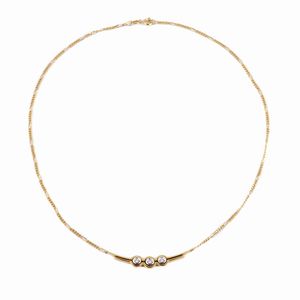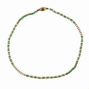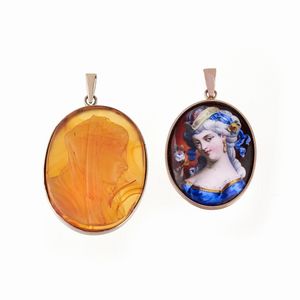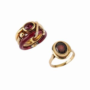 DUE ANELLI CON GRANATI in oro giallo 18kt, uno realizzato a doppio anello di cui uno rivestito in smalto rosso, [..]