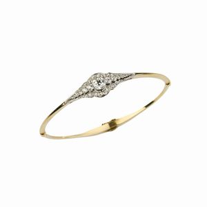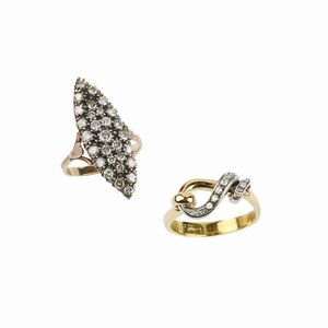 DUE ANELLI CON DIAMANTI di cui uno in oro giallo e bianco 18kt, realizzato seguendo un motivo a fiocco, impreziosito [..]