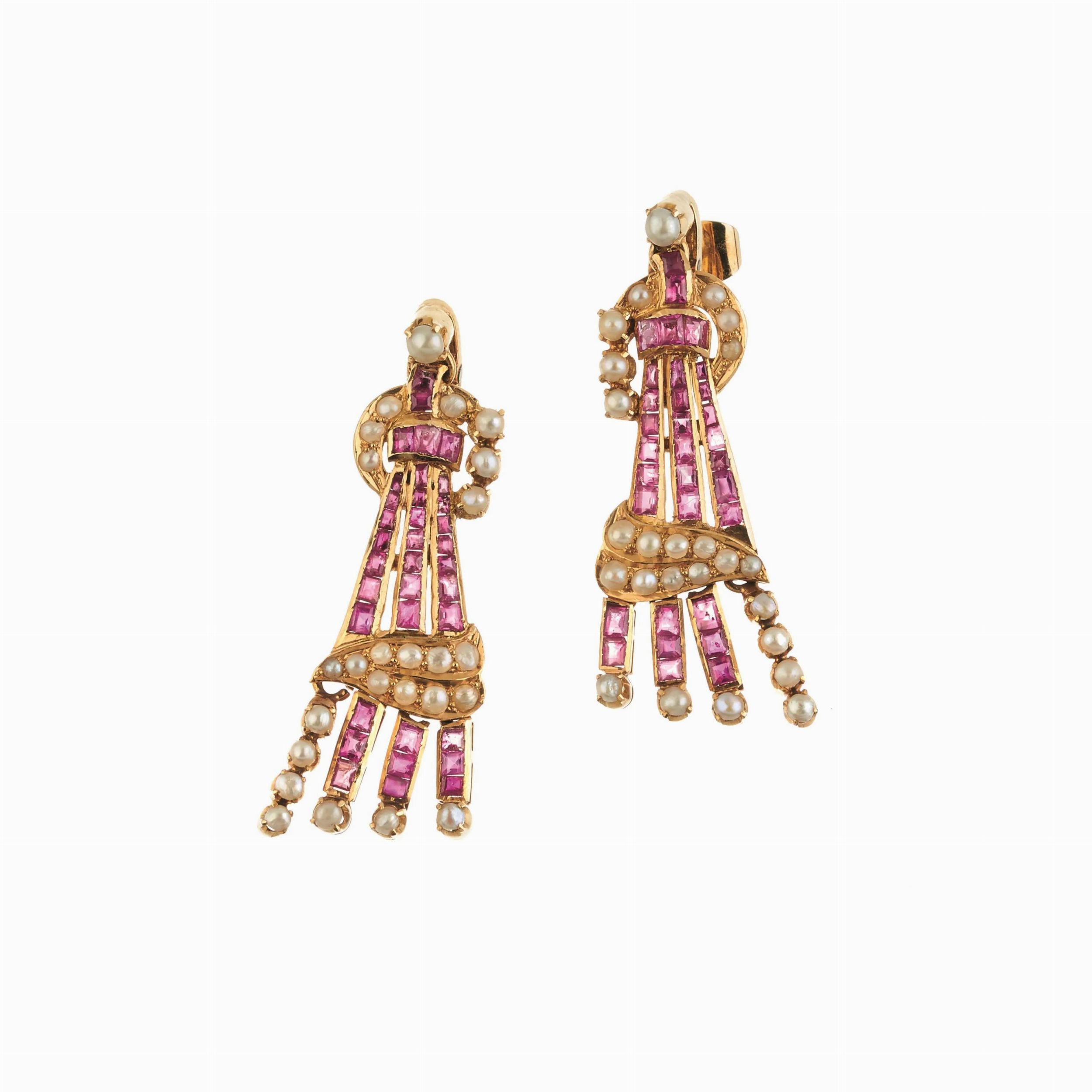 PAIO DI ORECCHINI PENDENTI CON RUBINI E PERLE