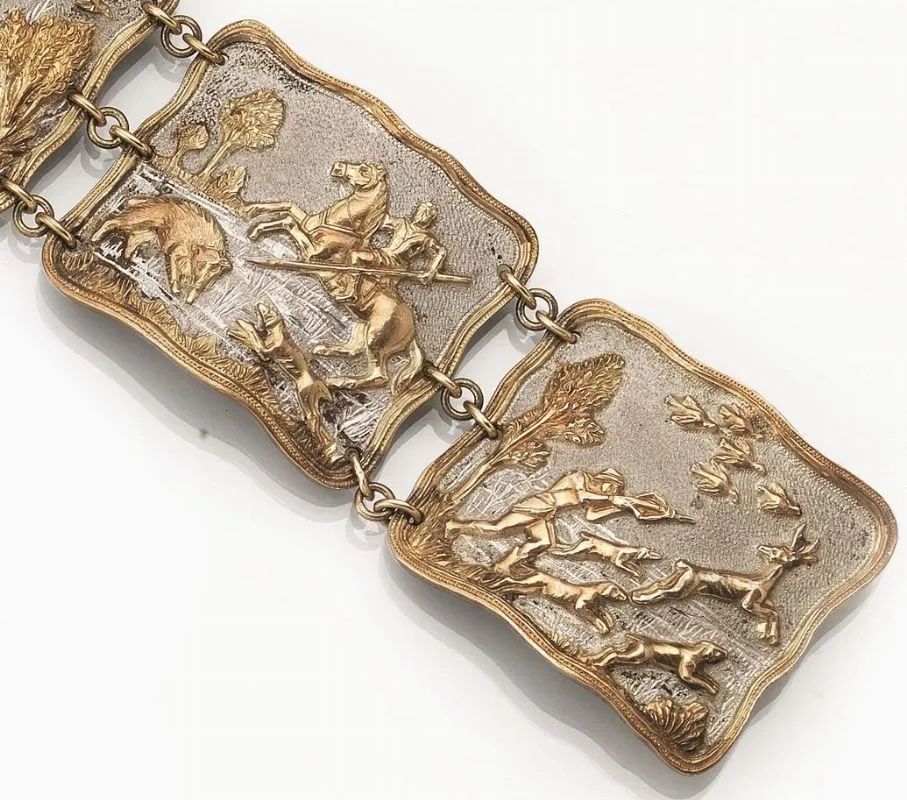 * Bracciale, Roberto Dughetti per Torrini, 1970, in oro giallo e argento realizzato ad una fila di quattro placche raffiguranti scene di caccia, punzoni 750 e Torrini firmato Roberto Dughetti, g 75