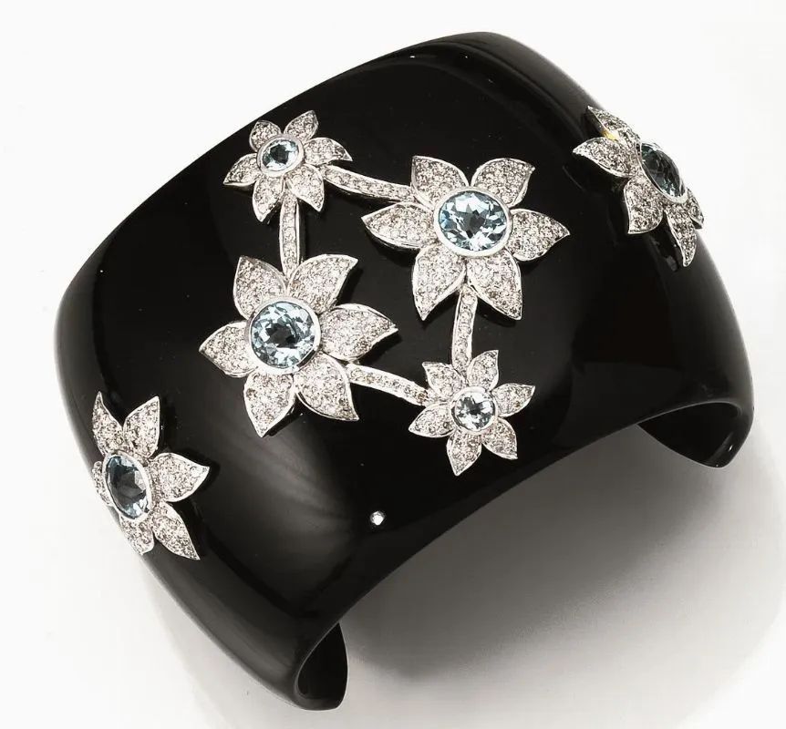 Bracciale in bachelite nera , oro bianco, acquemarine e diamanti realizzato come un semicerchio bombato in bachelite nera decorato da corolle in pavè di brillanti centrate da acquemarine sfaccettate, g 77