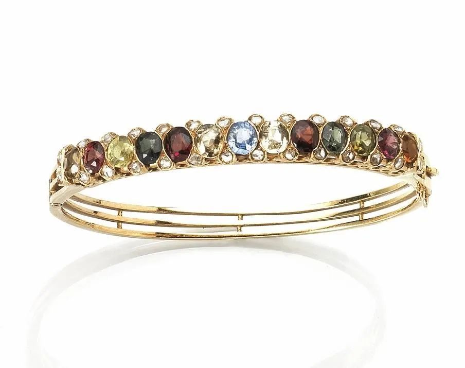 realizzato come un cerchio rigido a linee traforate decorato nella parte anteriore da una fila di pietre di colore ovali sfaccettate e intercalate da coppie di rose di diamante, punzoni francesi, g 21