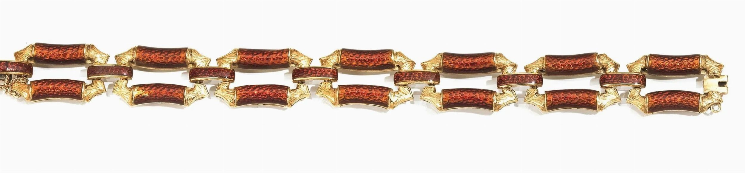 realizzato come una fila di maglie sagomate cesellate in parte decorate da smalto rosso, g 48 lordi, lievi danni