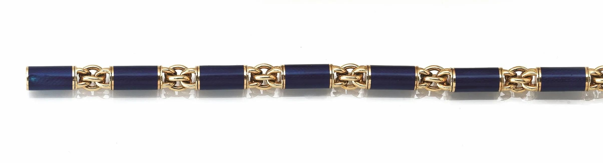 realizzato a d una fila di otto barilotti in oro giallo rivestiti in smalto blu alternati a maglie ad anello concatenate, punzone 750, g 81 , alcuni danni allo smalto