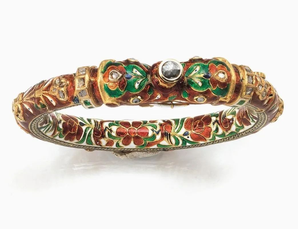 Bracciale, India, in oro giallo, smalti e diamanti modellato a cerchio rigido bombato interamente decorato da rose di diamante e da smalti policromi raffiguranti fiori e volatili, nella parte anteriore due teste di elefante con zanne in smalto bianco e proboscidi intrecciate culminanti in una rosa di diamantecircolare, g 88