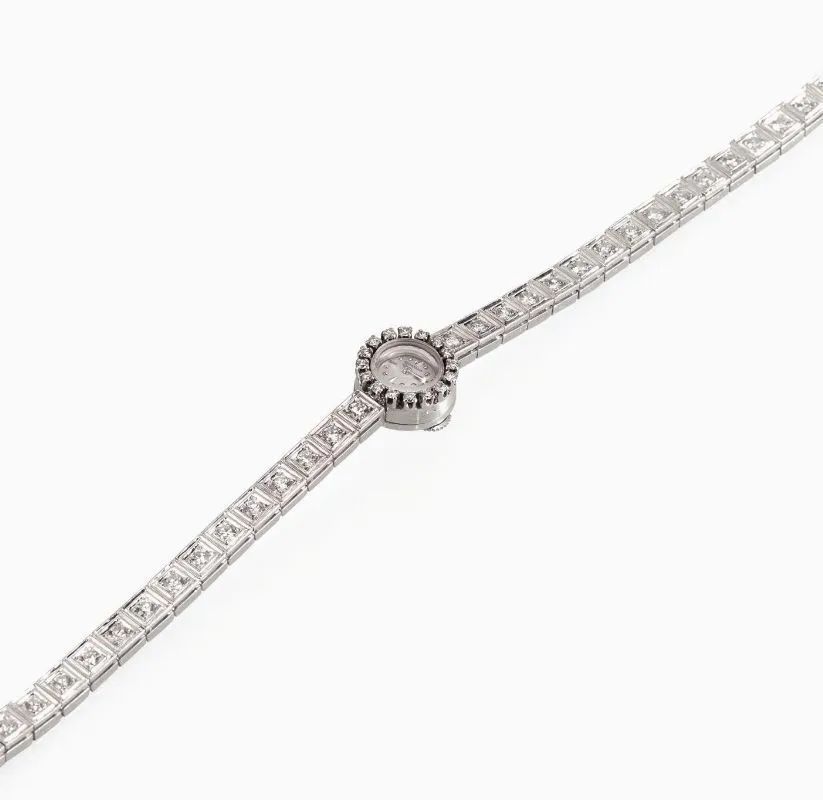 BRACCIALE-OROLOGIO JAEGER LE COULTRE, ANNI '60, CASSA N. 775'731, IN ORO BIANCO E DIAMANTI Cassa con fondello a scatto, lunetta decorata in brillanti, corona di carica sul fondello. Quadrante argentè con indici puntiformi e a fraccia applicati. Movimento a carica manuale. Bracciale in oro bianco a maglie quadrate cesellate ciscuna centrata da un brillante, chiusura a scomparsa. Diam. mm 15,5