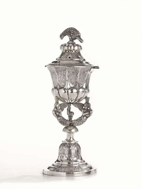 in argento, fusto realizzato da tre figure di suonatori alati, base decorata da foglie, coperchio traforato con finale modellato a pappagallo, alt. cm 17, g 440