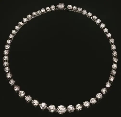 Collana, fine sec. XIX, in argento, oro rosa e diamanti realizzata ad una fila di cinquantuno diamanti taglio vecchio posti in gradazione, da ct 0 . 40 a ct 3 circa per complessivi 32 ct circa, g 34