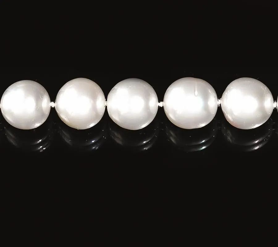 realizzata ad una fila di perle diam.  da mm 10 a mm 12, fermatura a sfera allungata decorata da morivi romboidali in oro bianco e brillanti , punzone 750, g 84