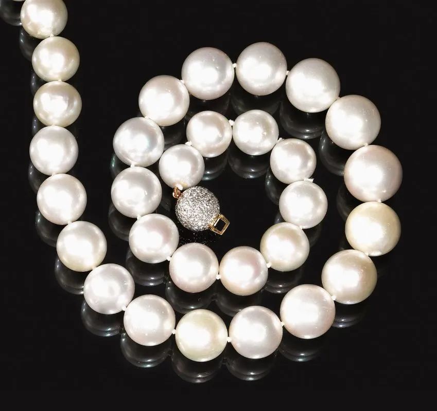 C ollana in oro bianco, oro giallo, perle australiane e diamanti realizzata ad un filo di perle dei Mari del Sud di diam. da mm 13 a mm 16, fermatura a sfera interamente decorata da pave di brillanti, punzone 18 kt, g 129 alcune perle danneggiate