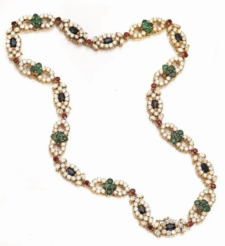 Collana in oro giallo, rubini, zaffiri, smeraldi e diamanti