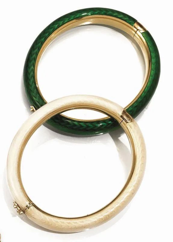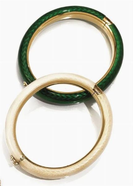 ciascuno modellato a cerchio rigido in oro giallo,  rivestiti rispettamente in smalto verde e avorio, g 113,   entro scatole Parenti, lievi danni allo smalto