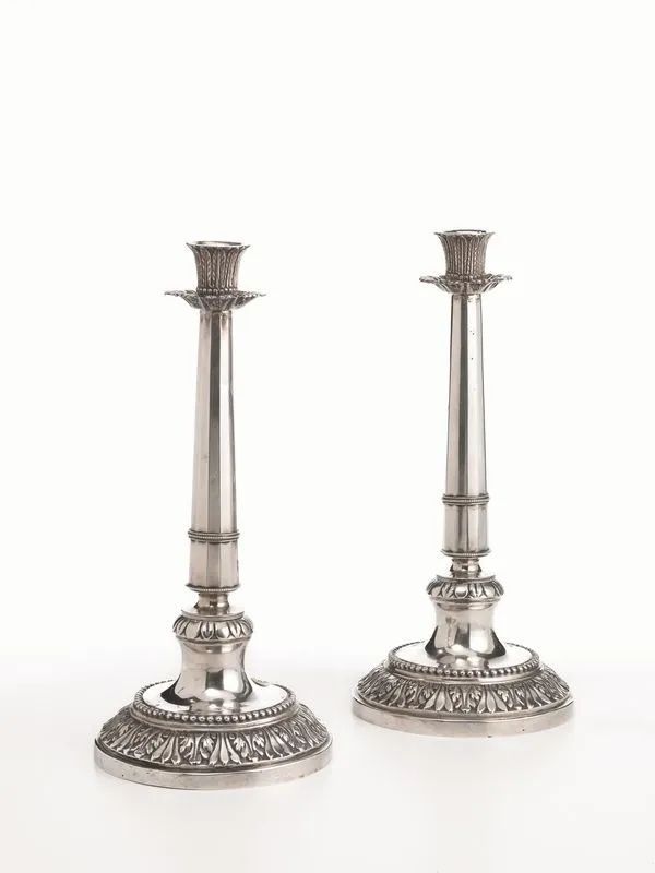in argento, fusto a colonna sfaccettata su base circolare con profilo sbalzato a foglie d'acanto, alt. cm 31, g 790 (2)