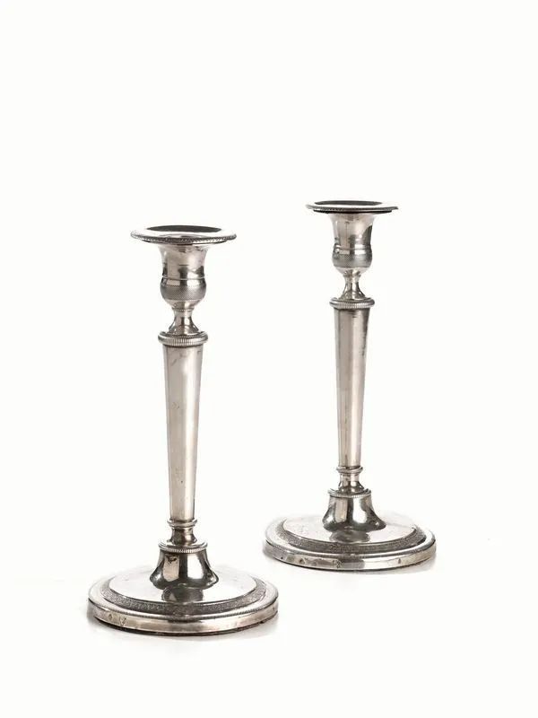 COPPIA DI CANDELIERI, TORINO, FINE SEC. XVIII-INIZI SEC. XIX, SAGGIATORE GIUSEPPE [..]