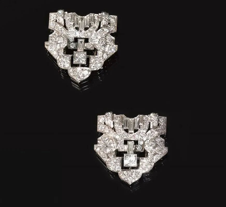 Coppia di clips-orecchini, Deco', Cusi, in oro bianco e diamanti