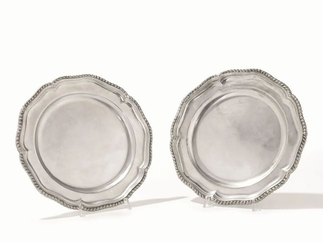 in argento di forma circolare sagomata con bordo a cordonetto, diam. cm 24,5, g 1275 (2)