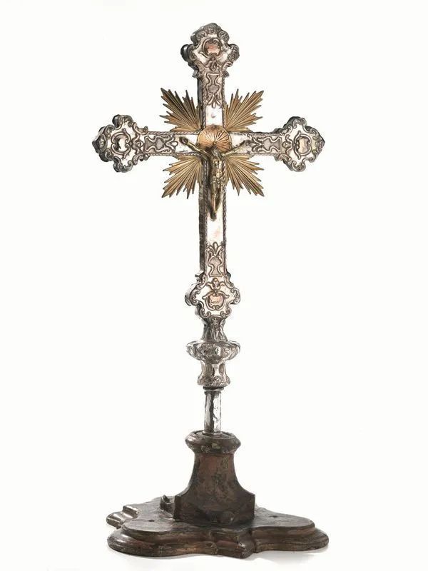 in rame argentato e dorato, croce decorata da volute, base in legno di forma sagomata non pertinente, alt. cm 89, lievi danni