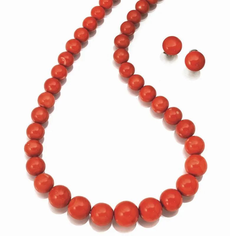 Demi-parure composta da collana e paio di orecchini in oro giallo e corallo