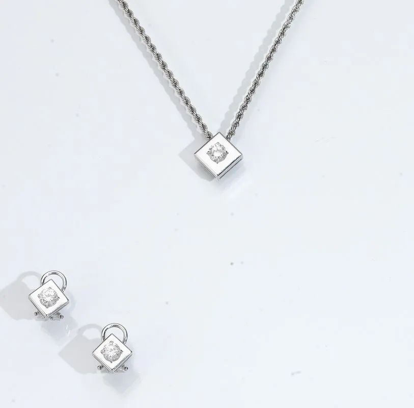 Demi parure in oro bianco e diamanti composta d a paio di orecchini e pendente ciascun orecchino realizzato a forma quadrata in oro bianco con al centro un brillante, punzone 750; il pendente con catenina torchon en suite con gli orecchini, g 12 complessivi