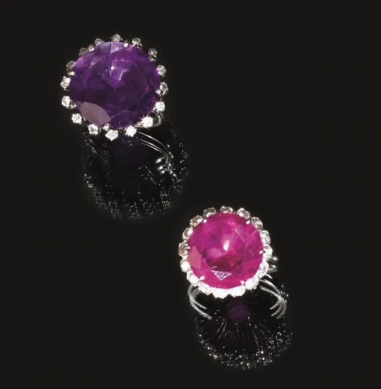 Due anelli in oro bianco , rubino sintetico e zaffiro sintetico con cambio di colore un anello con rubino sintetico entro cornice di brillanti; l'altro con zaffiro sintetico con cambio di colore entro cornice di brillanti, g 17 complessivi