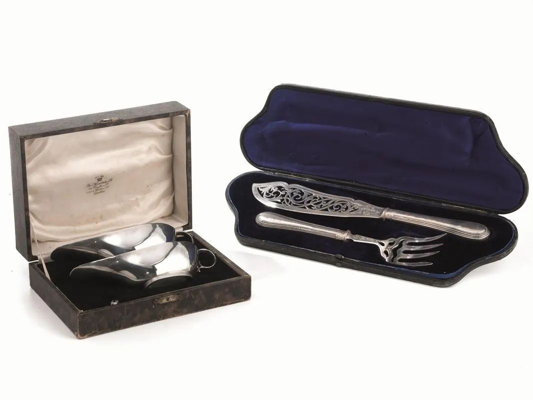 In argento traforato, manici profilati a puntinature, entro astuccio, g 210